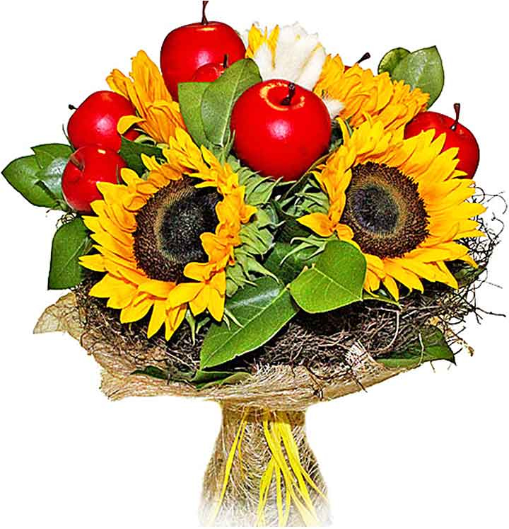 1 подсолнух, 1 яблоко, зелень, упаковка3 подсолнуха, 2 яблока, зелень, упаковка5 подсолнухов, 5 яблок, зелень, упаковка